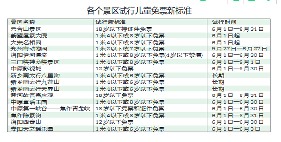 河南16家景区宣布儿童免票新标准 尝试按年龄卖票