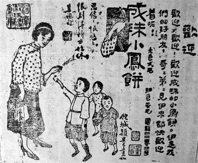 1924年6月1日《广州民国日报》上的成珠小凤饼广告,可爱的幼童围着一位白衫黑裙的女子讨要好吃的小凤饼,广告词采用拟人的手法,将成珠的小凤饼比作这位白衫黑裙的广州女子,寓意小凤饼就像小朋友的大姐姐一样可亲可爱:“欢迎欢迎,欢迎成珠的小凤饼,伊是我们的好朋友,哥弟见伊来,都快欢迎着呢!”