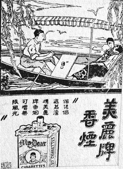 地方景观的精妙挪用,是手法之一。1924年《广州民国日报》上刊载了一则美丽牌香烟广告,广告词写道:“偕伴侣游荔湾,携美丽牌香烟,可增添无限风光。”香烟广告设置了一幅充满浓郁地域文化风韵的场景:清风徐徐、柳条飘曳的荔湾湖,穿着时髦的新式男女,游船赏景、互诉衷肠。